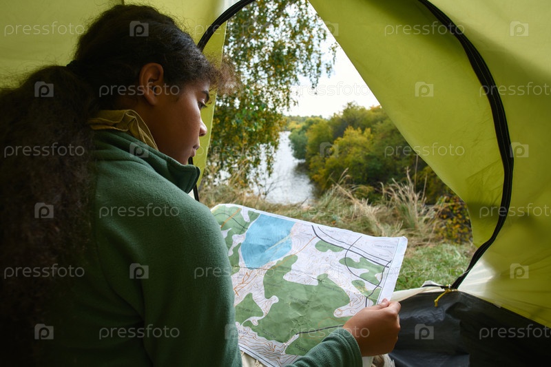 Девочка, читающая карту в палатке