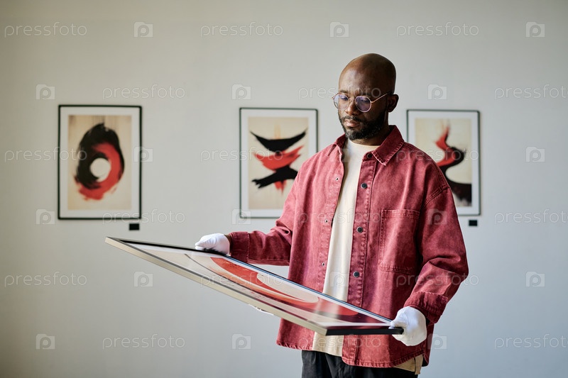 Человек, держащий обрамленное произведение искусства в галерее