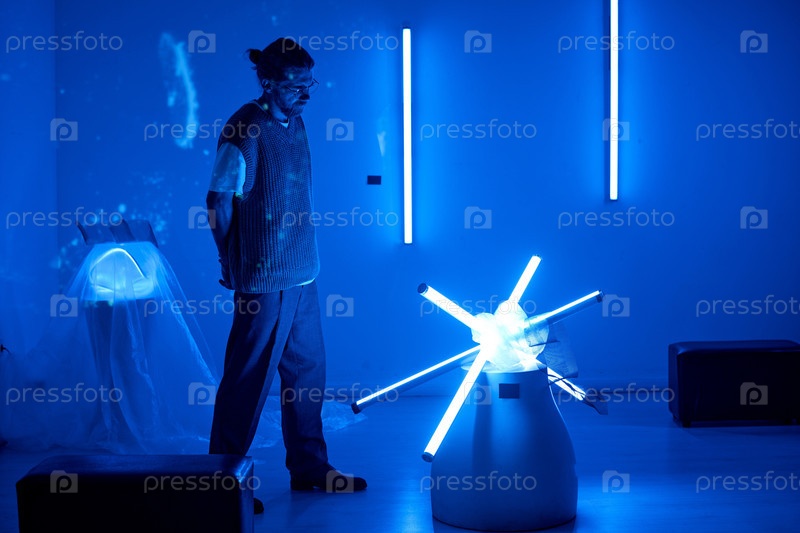 Опыт современного искусства в голубо освещенном выставочном зале