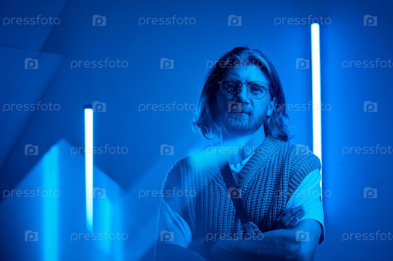 Портрет мужчины в неоновом синем свете с складываемыми руками