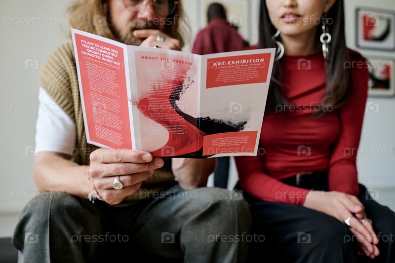 Обсуждение брошюры художественной выставки, сидя вместе