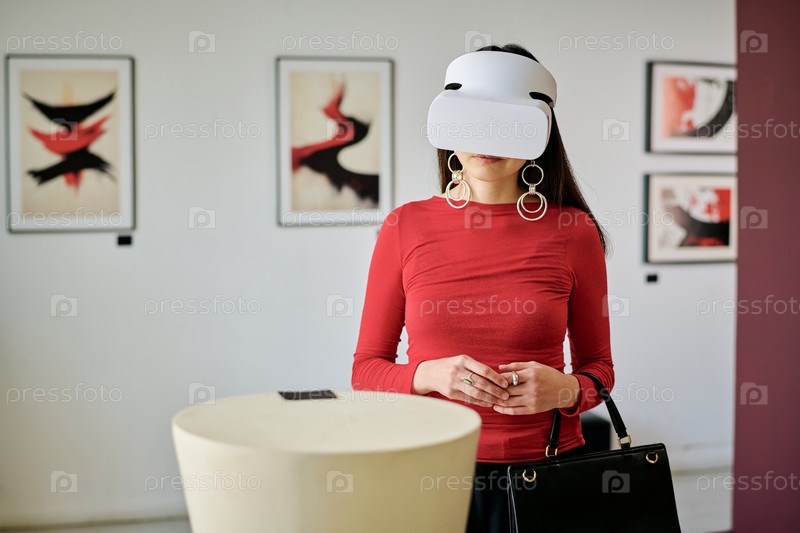 Женщина, испытывающая виртуальную реальность в художественной галерее