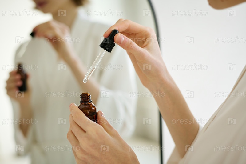 Элегантные женские руки, держащие стеклянную бутылку и пипету с сывороткой для лица