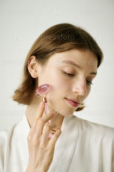 Молодая женщина массажирует лицо
