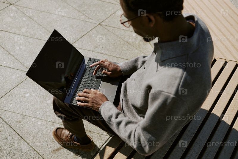 Работать на ноутбуке, сидя на скамейке на открытом воздухе