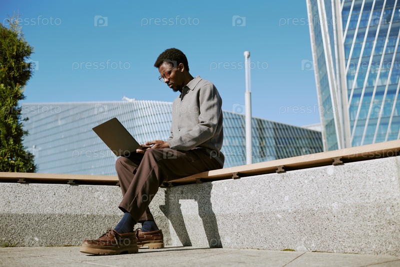 Работа с ноутбуком на открытом воздухе в городской среде