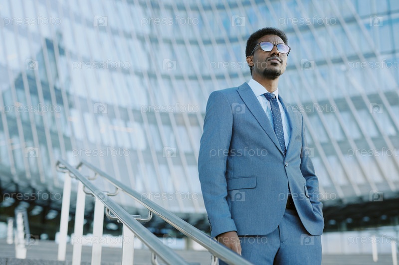 Уверенный бизнесмен, стоящий напротив современного здания с внешней стороны