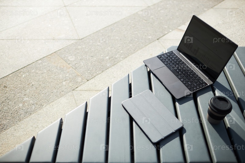 Ноутбук с кофейной кружкой на открытой наружной скамейке