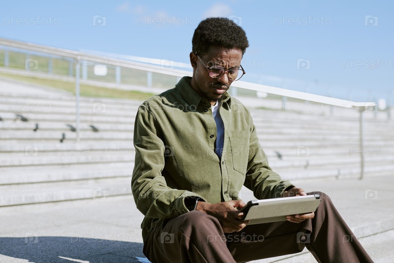 Африканский американец использует планшет на открытом воздухе