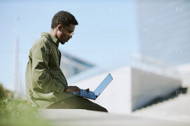 Работа удаленно на открытом воздухе с ноутбуком в солнечный день