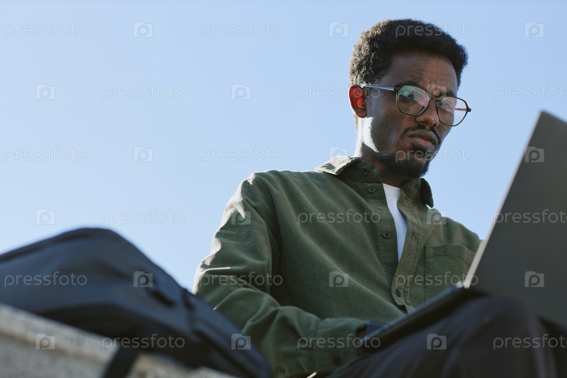 Работа на открытом воздухе на ноутбуке возле рюкзака