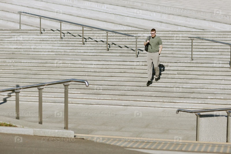 Бизнесмен идет по наружной лестнице в полдень