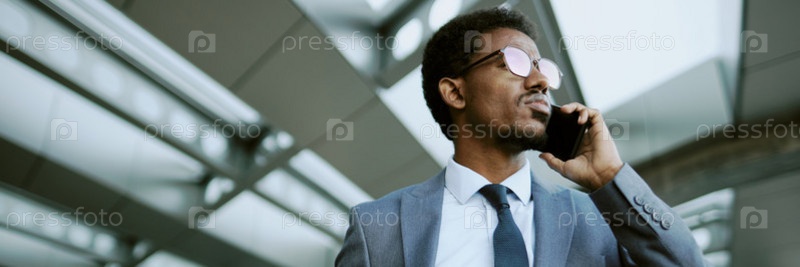 Уверенный бизнесмен разговаривает со смартфоном на открытом воздухе