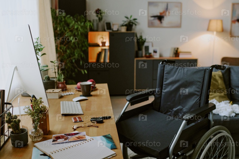 Уютный домашний офис с инвалидным креслом и растениями, создающими атмосферу