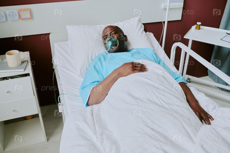 Отдыхающий афроамериканский пациент, носящий кислородную маску