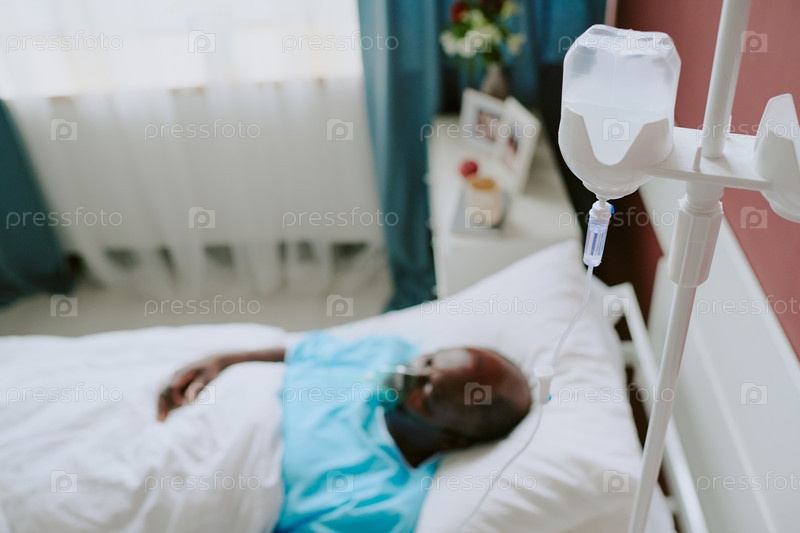 Пожилой пациент, отдыхающий в больничной постели с внутривенной капелькой