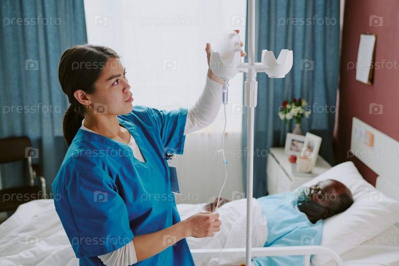 Медсестра, посещающая пожилого пациента в больничной комнате