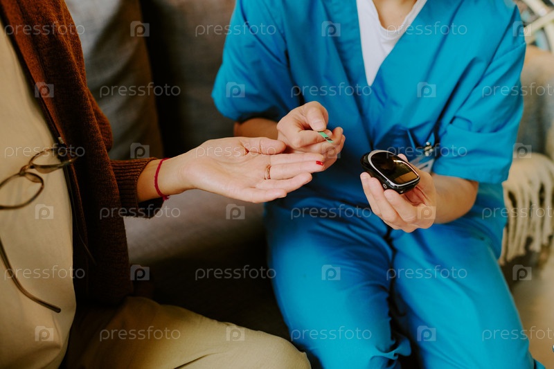 Медсестра проверяет уровень сахара в крови с помощью глюкометра