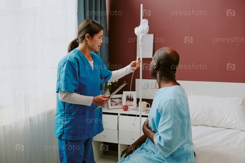 Медсестра помогает пожилому пациенту, носящему больничный халат