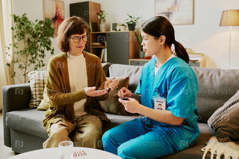 Сестринский профессионал помогает старшей женщине на диване