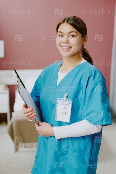 Портрет улыбающейся медсестры, держащей медицинские документы