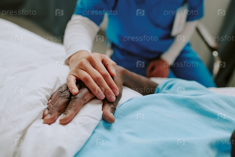Руки у больничной кровати с пациентом, носящим удостоверение личности