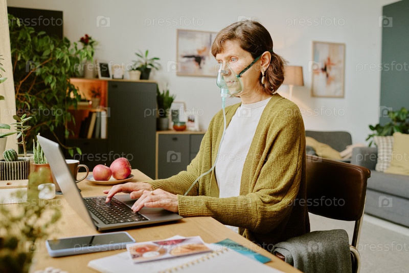 Пожилая женщина, работающая из дома с кислородной маской