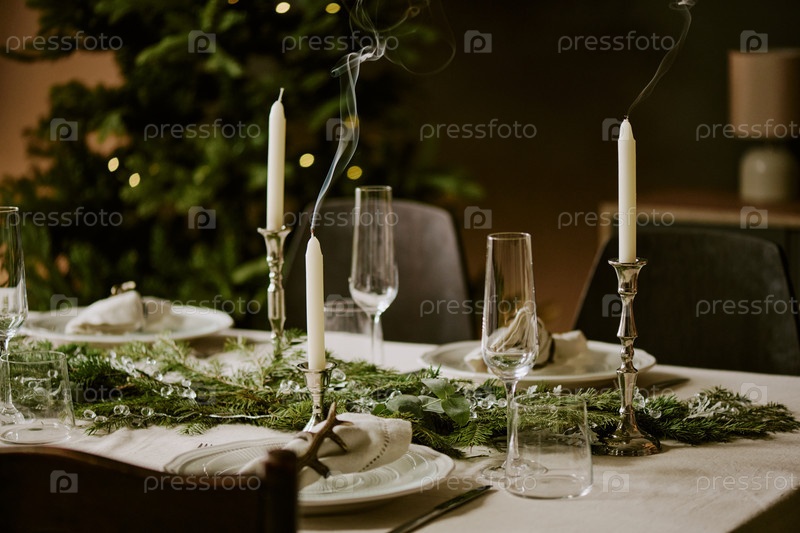 Угасшие свечи на деревянном столе с праздничными украшениями