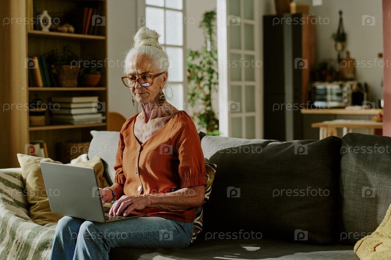 Пожилая женщина использует ноутбук на удобном диване