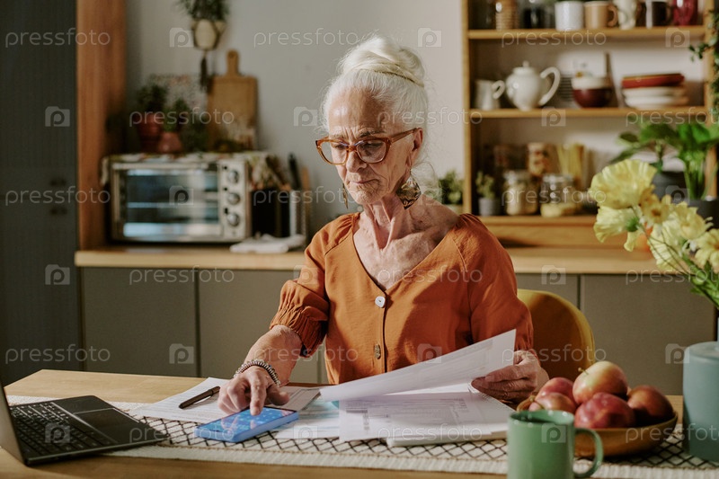 Старшая женщина, просматривающая документы на рабочем столе домашнего офиса