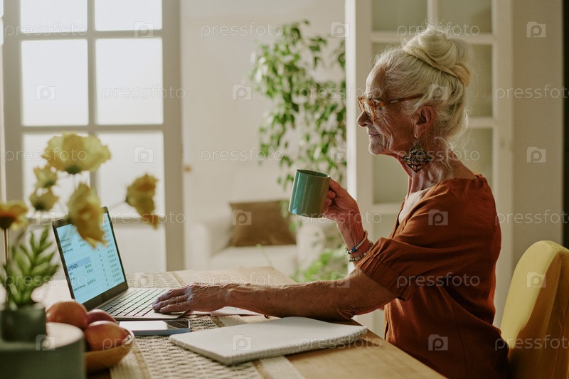 Пожилая женщина наслаждается кофе, читая на ноутбуке