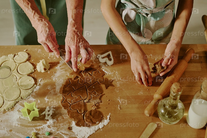 Пожилая женщина печет печенье с ребенком на кухне