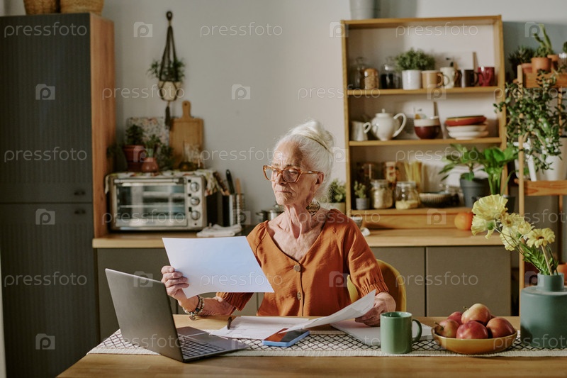 Пожилая женщина читает бумаги в уютной кухне
