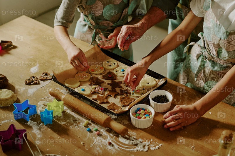 Дети украшают праздничные печенье на современной кухне