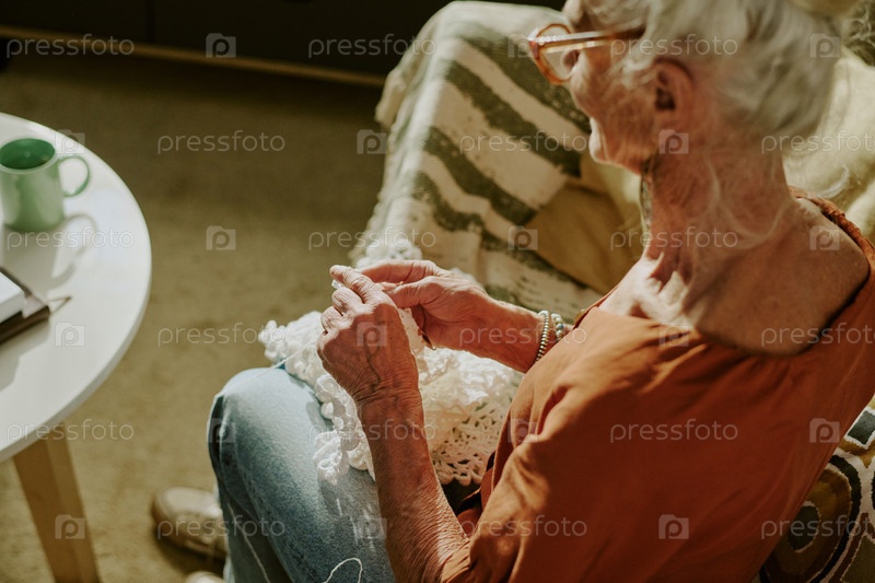 Пожилая женщина, занимающаяся вязанием в домашних условиях