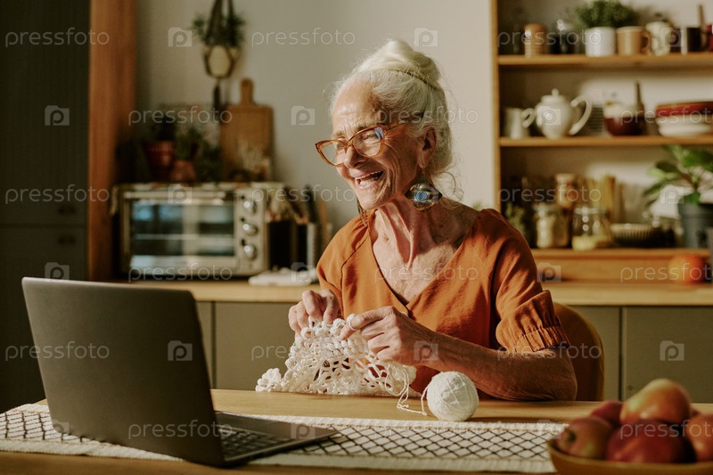 Улыбающаяся старшая женщина вяжет в уютной кухне