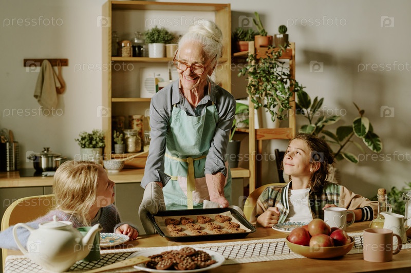 Пожилая женщина печет печенье с детьми на кухне
