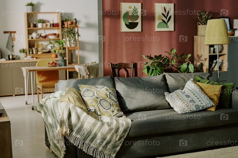 Уютная гостиная с растениями и декоративными предметами