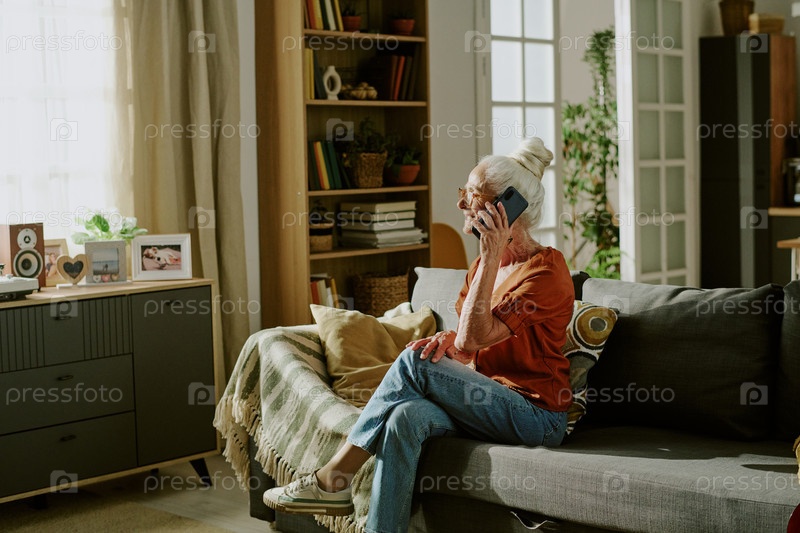 Пожилая женщина сидит на диване и пользуется смартфоном