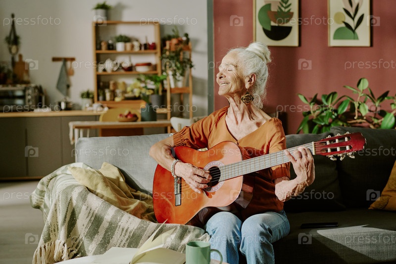 Пожилая женщина играет на гитаре в уютной обстановке гостиной