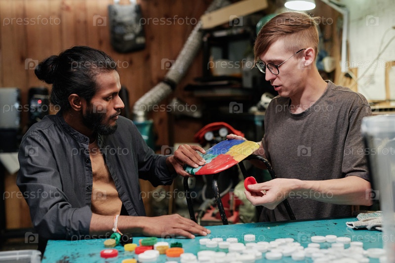 Молодой работник прикасается к пластиковому стулу
