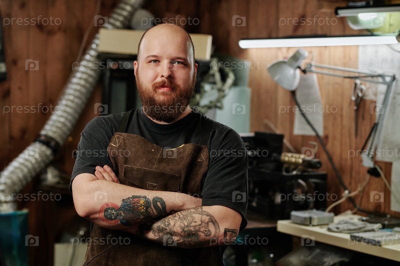 Молодой бородатый техник с татуировками