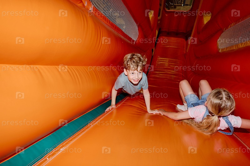 Дети играют на мягких кожаных горках