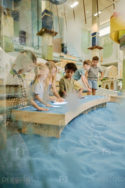 Дети рисуют на столе с синим песком