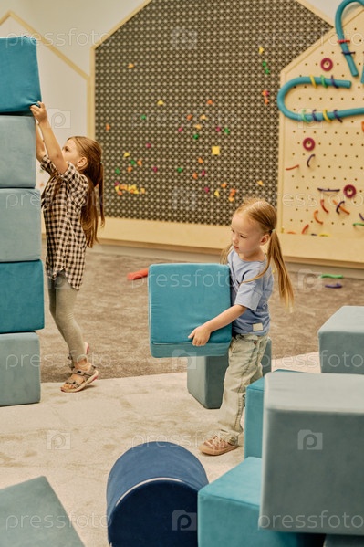 Маленькая девочка, несущая большой кубик мягкой игрушки