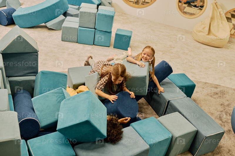 Счастливые дети играют с кубиками мягкой игрушки