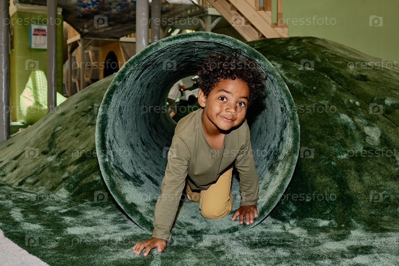 Улыбающийся мальчик сидит внутри игрушечной трубы