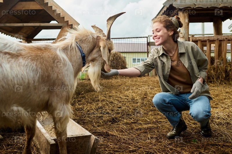 Кормление бежевой чистокровной козы из рук