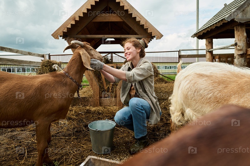 Фермер, кормящий и ласкающий чистокровных коз
