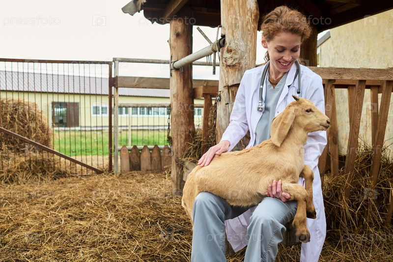 Ветеринар держит козла на коленях